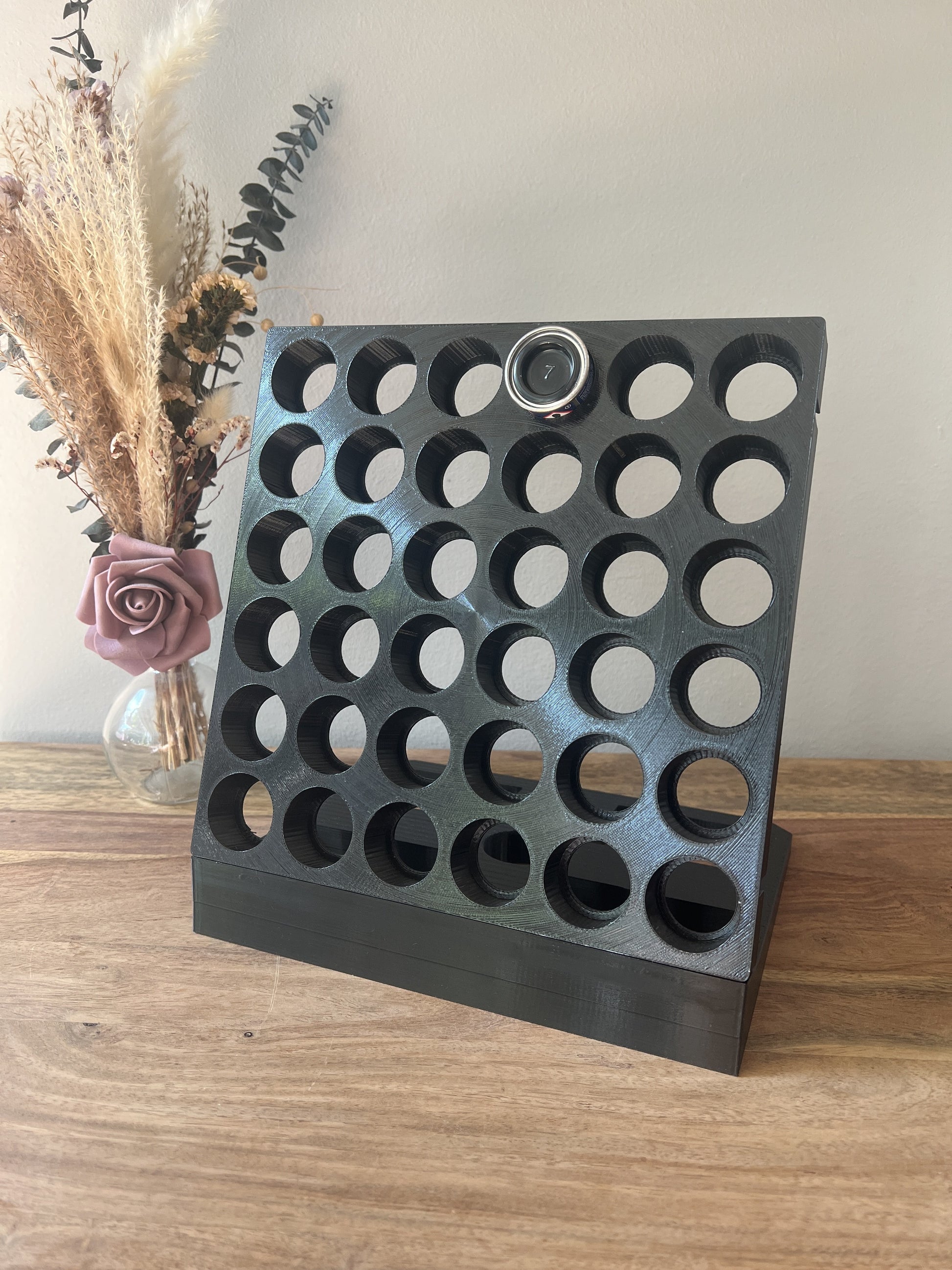 Das Regal bietet platz für 36 runde Dosen mit einem Durchmesser von 3,1 cm zur sicheren aufbewahrung. Dank seines cleveren Designs können Sie Ihre Dosen bequem greifen und gleichzeitig Ihren Arbeitsbereich ordentlich und übersichtlich halten.